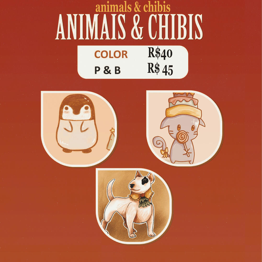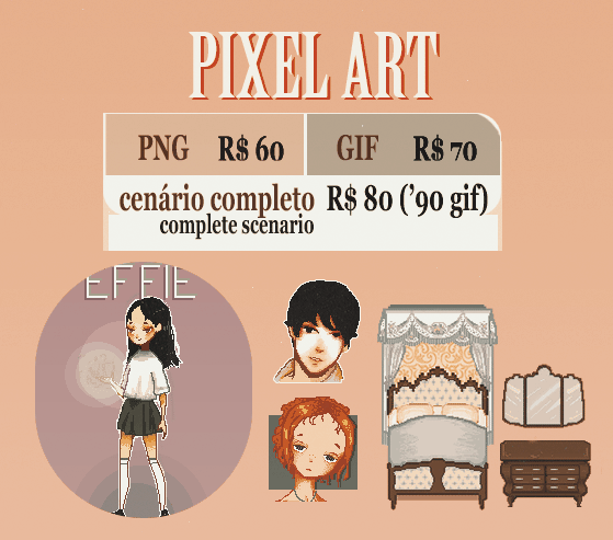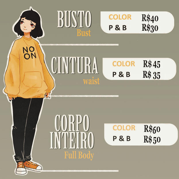 Ilustrações à mão (papel) tem custo a mais de R$15 em qualquer categoria abaixo (exceto pixel art).